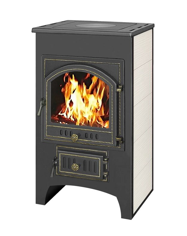 Корпус печи камина ВЕЗУВИЙ ПК-01 (205) выполнен из стали и облицован декоративной керамикой. Стальные печи быстро прогревают воздух в помещении. Начинают давать тепло уже через 15 минут после растопки. У печи-камина ВЕЗУВИЙ ПК-01 (205) топочная камера с двойными стенками. Такая конструкция снижает температурную нагрузку на корпус и продлевает срок службы печи-камина. Самый мощный тепловой «удар» принимает на себя керамика внутри топки. Материал устойчив к температурам до 1300 градусов и разрушительному воздействию остаточных продуктов горения. Когда он износится (а это произойдет не раньше, чем через несколько лет интенсивной эксплуатации), то стенки можно заменить.