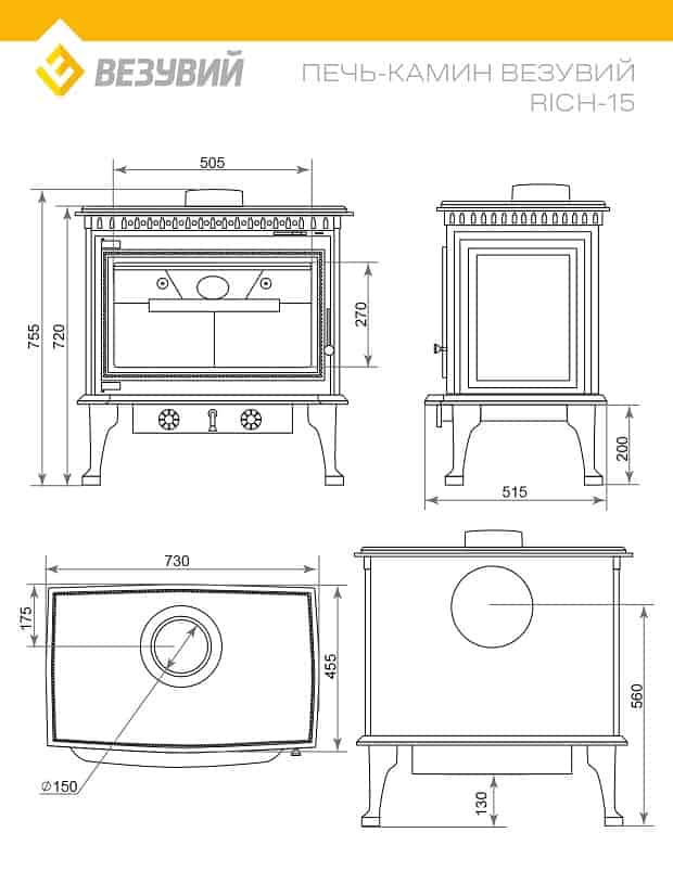 Патрубок дымохода – универсальный, со сменным положением. Он может быть установлен сверху или сзади в зависимости от размещения печи в помещении.