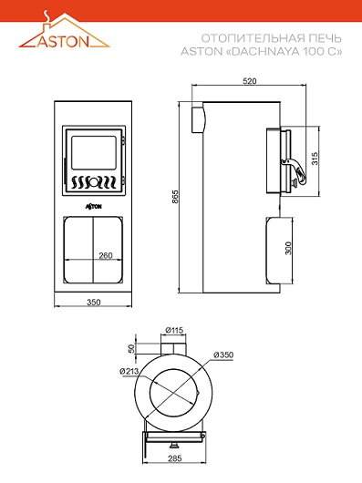 Отопительная печь ASTON " Dachnaya 100" С имеет цилиндрическую форму, с удобной остеклённой стальной дверью и съёмной верхней конфоркой из особо прочной стали. Аккуратная, компактная и эстетичная печь рассчитана на прогрев помещений объёмом до 100 кубических метров. На печи можно готовить или разогревать еду.