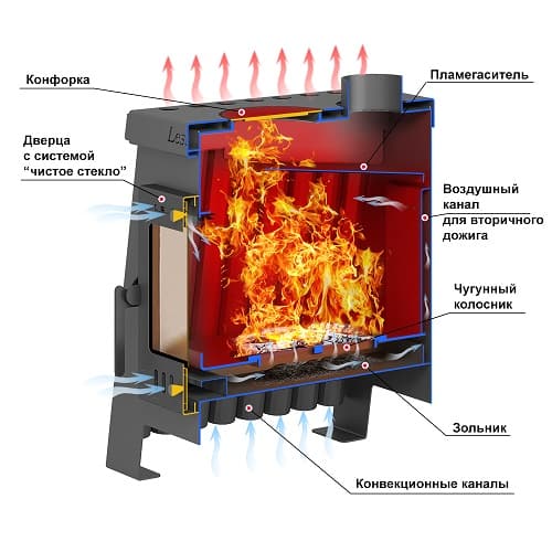 Конструкция печи включает в себя топку с пламегасителем и каналом вторичного дожига. Стенки топки выполнены из металлических труб, являющихся эффективными конвекторами. За счёт такой конструкции значительно ускоряется прогрев помещения, повышается эффективность сгорания топлива.