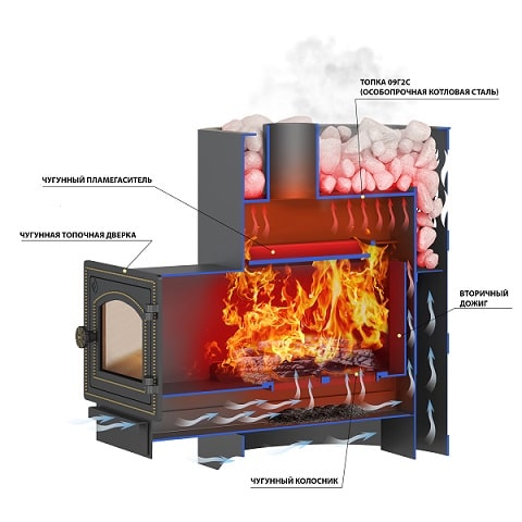 Чугунные детали - колосник и пламегаситель, не меняют своей геометрии во время топки, хорошо противостоят высокой температуре.