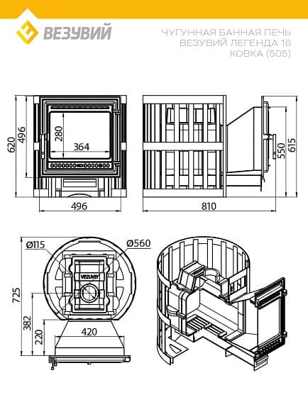 Банная чугунная печь Легенда Ковка 16 (505) укомплектована чугунной герметичной дверцей Везувий 505 с жаропрочным стеклом «SCHOTT ROBAX». Конвекционно-вентилируемый кожух "Ковка" изготовлен из металлической текстурированной полосы покрашенной термостойкой краской и покрытая патиной «Бронза».