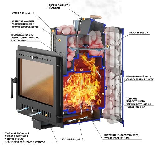 - Каменка: Комбинированная (Сетка/кожух + закрытая каменка)