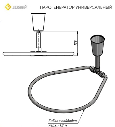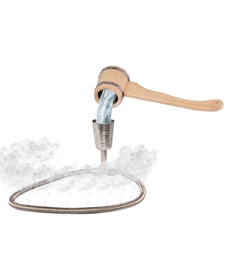 Трубка парогенератора сделана в виде гибкого кольца, чтобы количество воды, подаваемой в разные стороны каменки, было одинаковым и камни слева и справа от парогенератора имели одинаковую температуру.