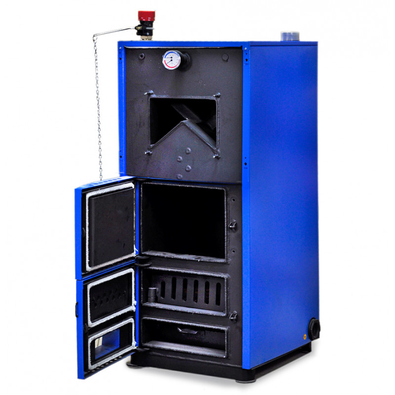Важное преимущество котла - рабочее давление 3 атмосферы, что служит гарантией безопасной эксплуатации и влияет на достижение максимального возможного КПД отопительной системы. Котел выдерживает кратковременное повышение давления до 4 атм. В отличие от чугунных котлов, подобные нештатные ситуации не приводят к выходу котла из строя и не грозят взрывом. Для обеспечения эффективного процесса горения все модифик ации котла снабжены автоматическим тягорегулятором и термоманометром для внешнего контроля температуры и давления тепло носителя.